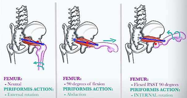 Zunanjo rotacijo m. piriformis najbolj učinkovito izvaja v stoječem položaju, ko je noga vzporedna z vzdolžno osjo telesa. V tem položaju se sila upora s strani mišice (modra črta na skici) izvaja pod osjo sklepa (rdeča pika na skici). S povečevanjem fleksije v kolku (ko se s trupom približujemo nogam) postaja m. piriformis vedno šibkejši zunanji rotator kolka in njena funkcija prehaja v abdukcijo kolka. Iz skice je lepo razvidno, da sta v tem položaju sila upora mišice in os sklepa v isti ravnini. V določenem trenutku, približno v položaju 900 fleksije v kolku, m. piriformis pravzaprav ne izvaja nobene rotacije več ampak zgolj abdukcijo. Ko pa kolk pokrčimo preko 900 fleksije pa se sila upora s strani mišice izvaja nad osjo sklepa in posledično mišica potegne stegnenico v notranjo rotacijo.
