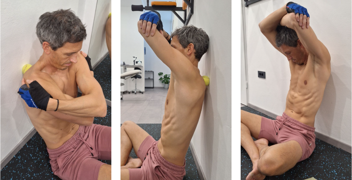 Pomembno: če se nam zdi, da boleče točke ne dosežemo več in je ne moremo več učinkovito sprostiti z upiranjem telesa v steno potem si pomagamo s tenis žogico. Upiranje na tenis žogico bo veliko bolj boleče, ker se pritisk ne bo porazdelil ampak bo zbran na eni točki. Najbolj smiselno je, da začnemo z uporom v steno, tenis žogico pa implementiramo v nadaljevanju, ko bolečina že nekoliko popusti.